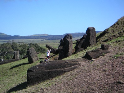 基本的に大味なつくりのモアイは、私にとって「ふーん」より少し上程度の感想なんですが、ラノララクで大量に転がっている、目的地へたどり着けなかったモアイたちの図はなかなか壮観でした。昔の人が四苦八苦してモアイを運んだ姿が偲ばれます。。