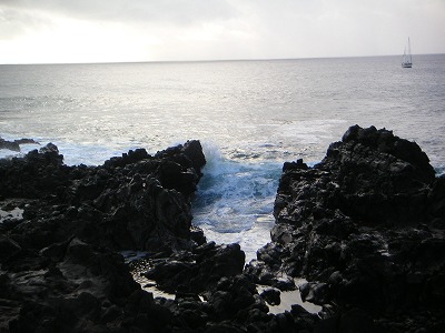 イースター島の人たちは、モアイを運ぶために島中の木を採り尽くしてしまって、なくなってしまったからモアイ作りをやめてしまったそうです。だからイースター島は丸坊主。現在はアナケナにタヒチから流れ着いたやしの木がたくさん生えています。昔もやしの木が生えていたら、今度は山がなくなるまで、岩を切り出してモアイ作ったのかなぁ。
