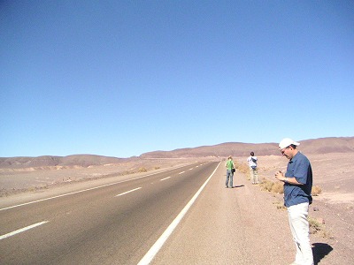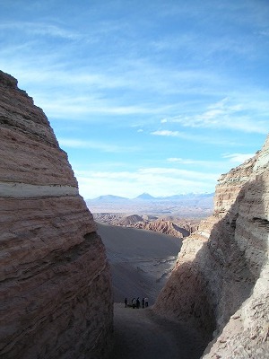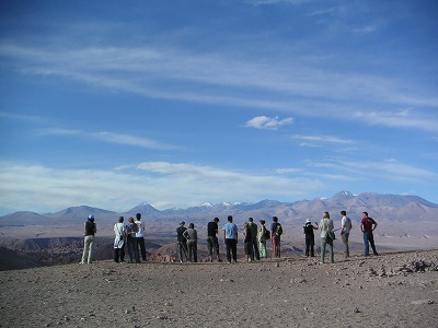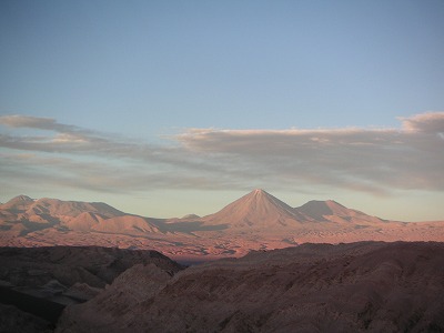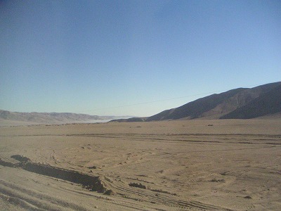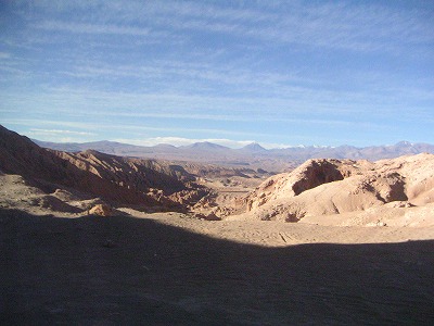 本日のツアーは、「VALLE DE LA LUNA」という、ここで一番メジャーな、砂漠で夕焼けを見るツアーです。4,5ヶ所くらい車で移動して、いろんな風景を楽しむ。・・・んだけど、3ヶ所目くらいで飽きた。最初はおおーと感激して写真取りまくってたんですが、やっぱり自然の景色に興味がないらしい。それでも最後のちょっとした坂道を登って、がんばって景色を堪能。いやー、広い。チリってだだっぴろい。