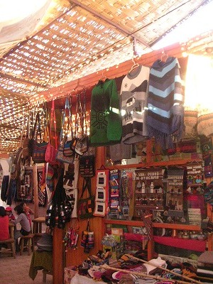 予約をした後は、15時の集合時間まで少し暇だったので、お土産屋さん散策。ここよりペルー・ボリビアのほうが間違いなく安いのでただの冷やかしですが。ただ、ツアーでは砂漠をちょっと歩くらしいので、日よけが必要かな、と黄色い帽子購入。2500P。