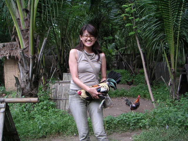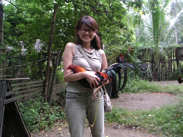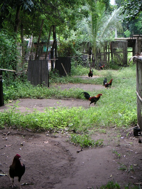 食事中、闘鶏の話が出て、私が「一度、見てみたいんだよねー」というと、だんなさんが闘鶏ファームのオーナーらしく、近くに自分のファームがあるので見においで、とつれてってくれました。トライシクル(バイクの横に座席がついた乗り物)で10分ほど。