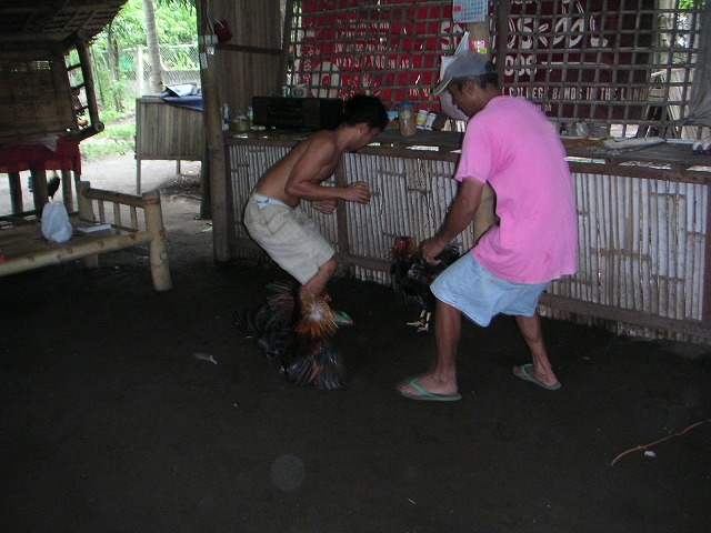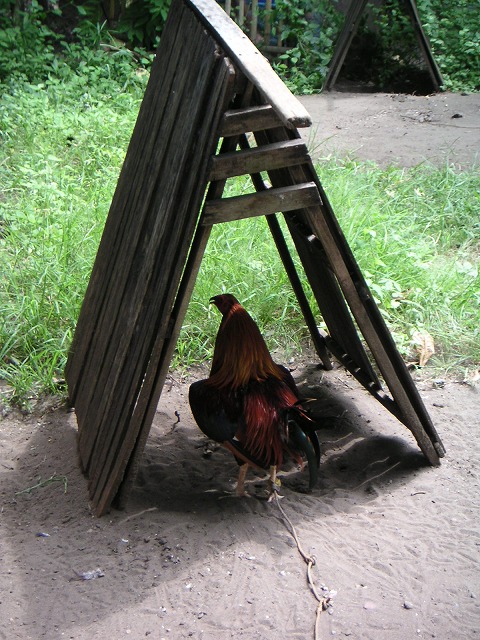 闘鶏ファーム!ちっこい三角のは、それぞれ鶏のおうちです。一羽ずつ家+庭を持ってるようす。喜びいさんで写真を撮ってたら、闘鶏の実際の競技を見せてもらいました。わーい。鳥がすんごいジャンプしながら戦うのは、迫力満点。写真は微妙にシャッターチャンスを逃した戦いのあと。鳥が怪我をする前に、人が止めに入ります。