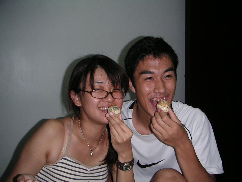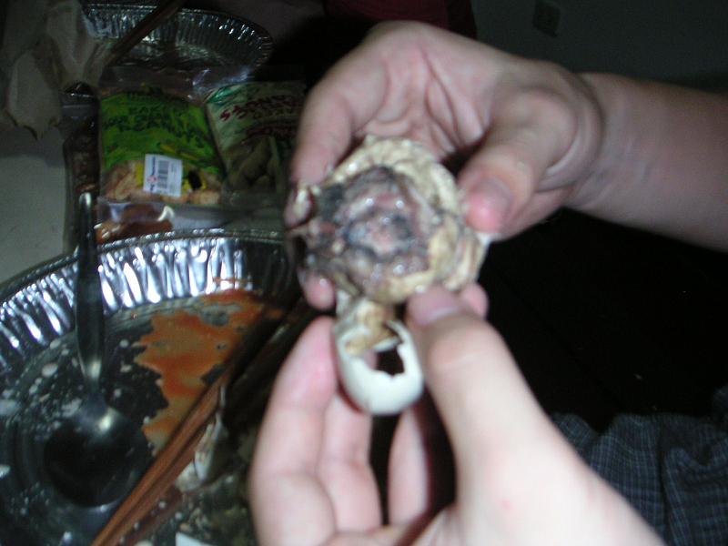 コトエさんちで飲んでいたら、みんなで「バロットを食べよう!」ということになりました。バロットとは、東南アジアではたまにみかける、アヒルの卵をゆでた(蒸した?)もの。孵化寸前の卵を使うので、中身がちょっとグロいです。一人で食べる勇気がなくて、今回が初バロットでした。わーい。味は玉子の味が濃くて、コクがあってウマかったです。