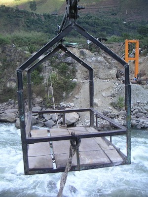 川の幅は、ざっと見ても2~300mくらいあって、高さも、落ちたら確実に死ぬくらい。私が「まじでか??」と硬直している横で、こたにんさんは何だか驚きながらも楽しそう。つーか、カゴ!すんごいシンプルなつくりなんですが、大丈夫???