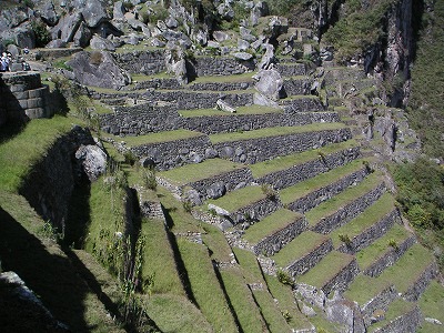 マチュピチュは市街地の周りをすべて段々畑として活用しているんだけれど、本当に使える場所はすべて使ったことが良くわかる。段々畑の一歩外は、本物の崖。がけっぷちを更に越えて、垂直ぎりぎりになるまで、農耕地として利用してる。