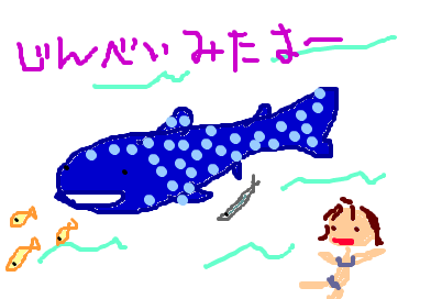 「ちっせぇ・・・・」が感想第一号。いや、3mといえば十分他の魚よりでかいんですが、大人だと15mくらいになるので。。かわいかったですよ。5分くらい一緒に泳いで、「Bボートにあがれー、A飛び込めー」を2回くらい繰り返して終了。
